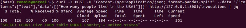 curl -X POST -H "Content-Type:application/json; format=pandas-split" --data '{"columns":["text"],"data":[["How many people live in the USA?"]]}' http://127.0.0.1:5001/invocations"SELECT COUNT Live FROM table WHERE Country = united states AND Name: text"And that’s it!
